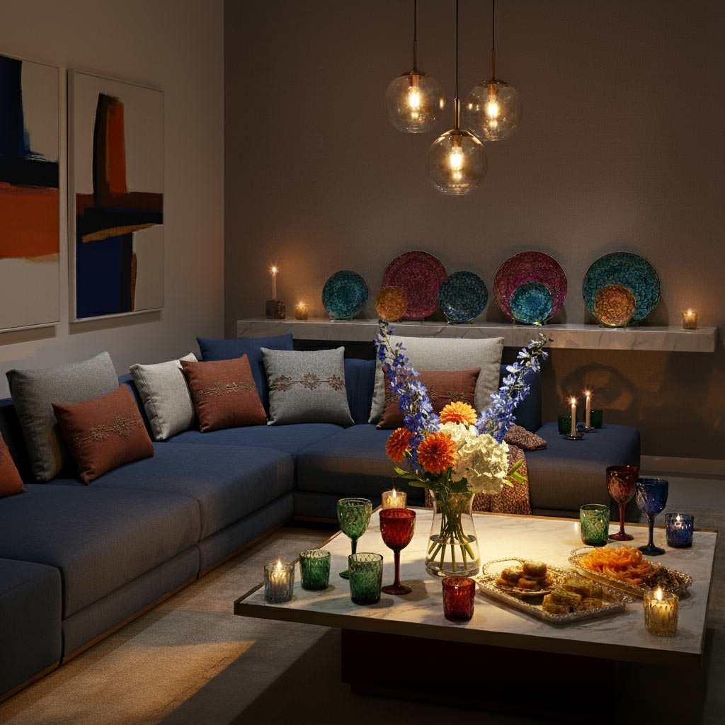 Colour doesn’t only belong to cushions and garlands. It can slip into glassware, dinner plates, wall art, and even the lighting you choose. Warm-toned bulbs add a golden glow, while coloured glass votives cast playful reflections. Even the sweets and fruits on display become part of the palette, their natural tones adding vibrancy to your décor.