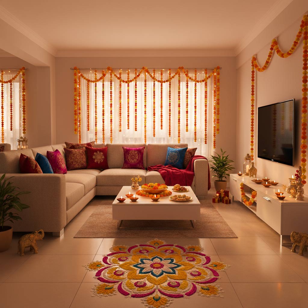 It’s easy to go overboard with colour during festivals, but balance keeps the space refined. Anchor the room with a dominant shade, then let supporting tones play a lighter role. For instance, a crimson table runner can be balanced with ivory crockery and just a touch of gold in the cutlery.