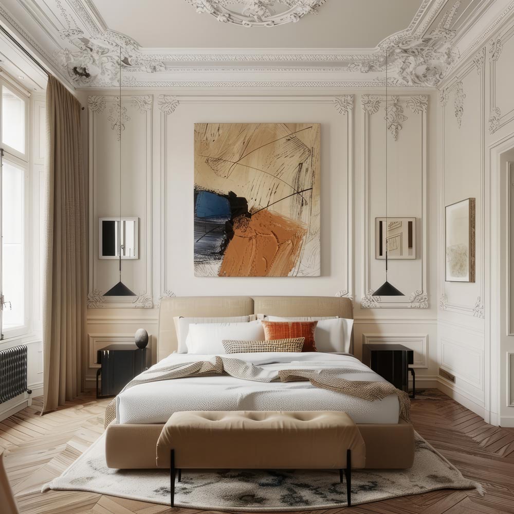 French-inspired interiors blend classic charm with modern sophistication. Elegant moldings, gilded mirrors, and plush furniture create a luxurious yet understated aesthetic. Pastel hues, vintage chandeliers, and intricate details add a touch of European grandeur while keeping the space chic and airy.