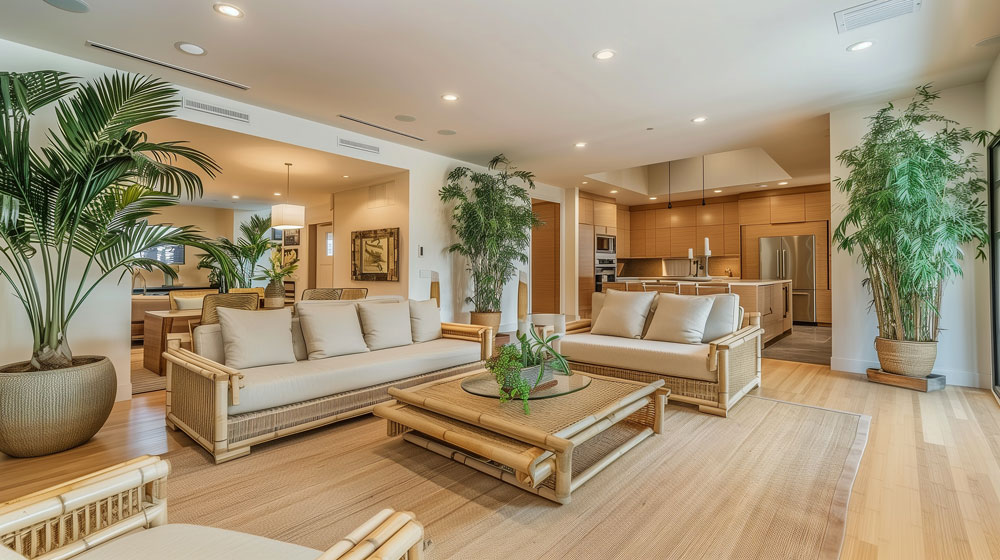 With urban spaces becoming more compact, the biophilic design trend is all about reconnecting with nature. This includes indoor gardens, green walls, and natural materials like bamboo, rattan, and reclaimed wood. Large windows, earthy tones, and ample greenery create a serene environment that promotes well-being.