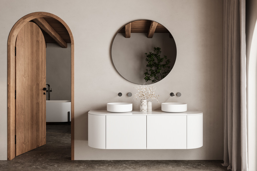 Modular systems are about smart design: components that fit, spaces that flex, finishes that last. But within that structure, there’s plenty of room for softness. Rounded laminates. Fluted profiles. Arched cut-outs. Pebble-shaped mirrors. Even open shelving with curved edges can shift the mood.
