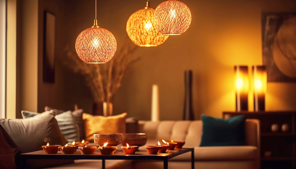 In urban homes, festive lighting can also double as statement décor. Sleek lanterns, geometric lamp shades, and smart LED strips can be styled alongside traditional diyas and candles. The fusion of old and new gives your home an edge that feels both sophisticated and rooted.